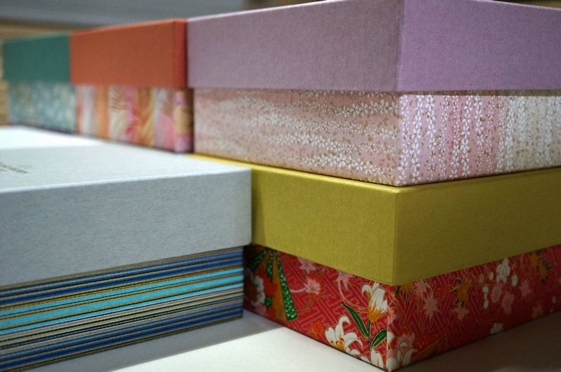 千代紙と民芸紙、仙貨紙を使用した貼り箱の作製事例です。