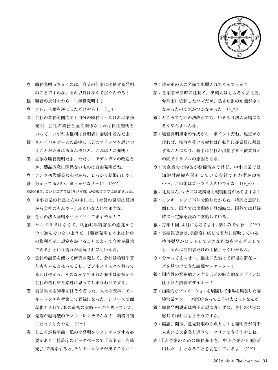 一般社団法人発明推進協会が発行している月刊誌「発明」で、「MPDPダイアリー」を連載中です。こてこて大阪弁のウルスくん&銀次郎助手との対談バージョンで、ヒット商品を生み出す「MPDP理論」をセキララに(笑)ご紹介します。