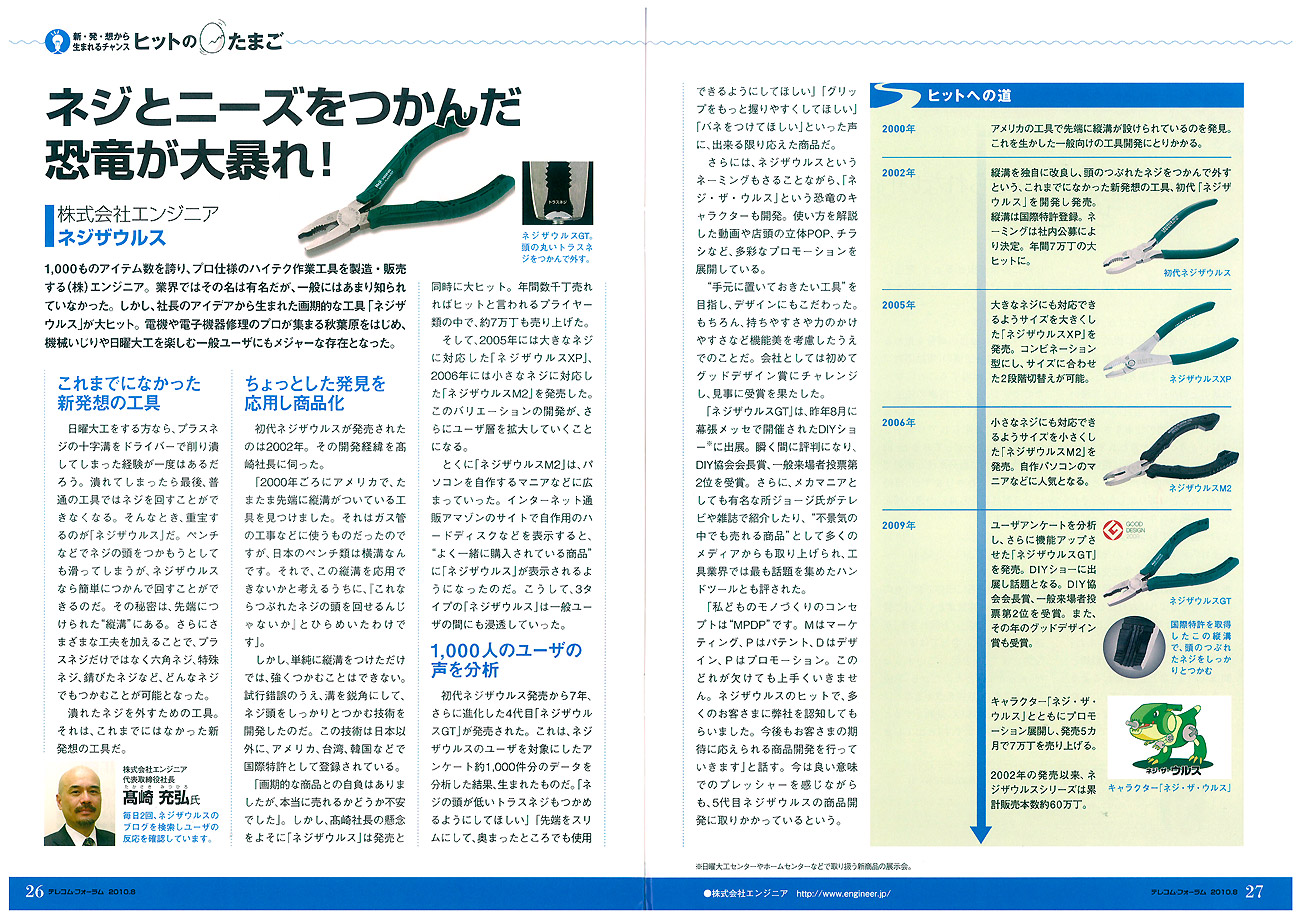 日本電信電話ユーザ協会の「テレコム・フォーラム」の最新号(2010.8)の「ヒットのたまご」のコーナーで、ネジザウルスが紹介されました!