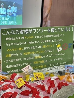 動物性たんぱく質へのアレルギー体質を持つワンちゃん用に、ウサギのお肉で作られたフード類の販売ブースもありました。